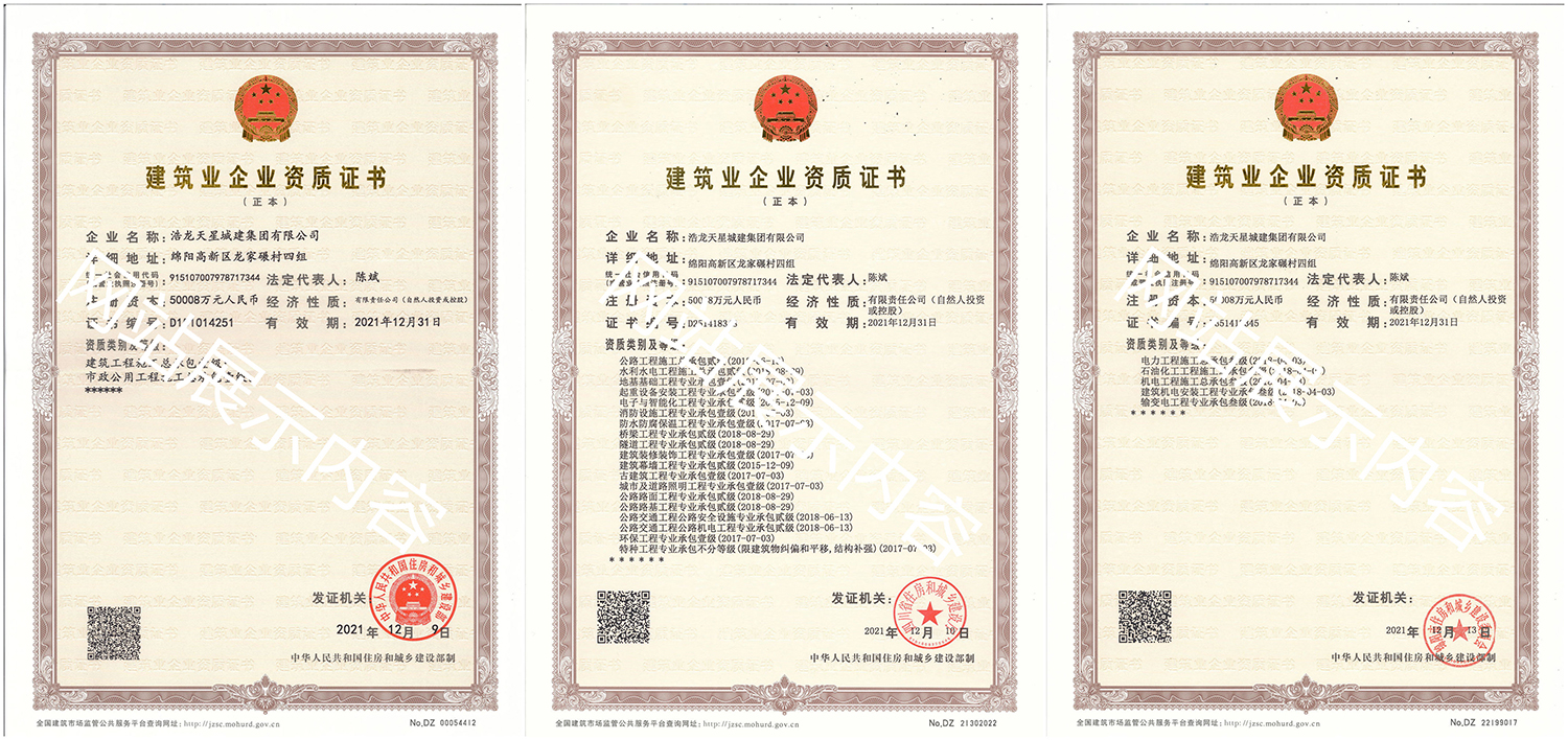 浩龍?zhí)煨浅墙瘓F有限公司,2007年成立于“李白故鄉(xiāng)、中國科技城”—四川省綿陽市,企業(yè)注冊資本金5.0008億元。公司共有27項建筑業(yè)企業(yè)資質,其中國家一級資質11項,二級資質10項,三級資質5項,特種資質不分等級1項,類別涵蓋建筑、市政、水利、機電、隧道、起重設備安裝等基礎及未來發(fā)展重點專業(yè)。公司下設三個辦事處,業(yè)務范圍輻射全國,在建項目三十余個,累計完成產(chǎn)值超11億元。公司是綿陽市建筑施工企業(yè)協(xié)會副會長單位、綿陽遂寧商會會長級單位、綿陽首批建筑業(yè)綠卡企業(yè),在綿陽本地企業(yè)中綜合實力名列前茅。